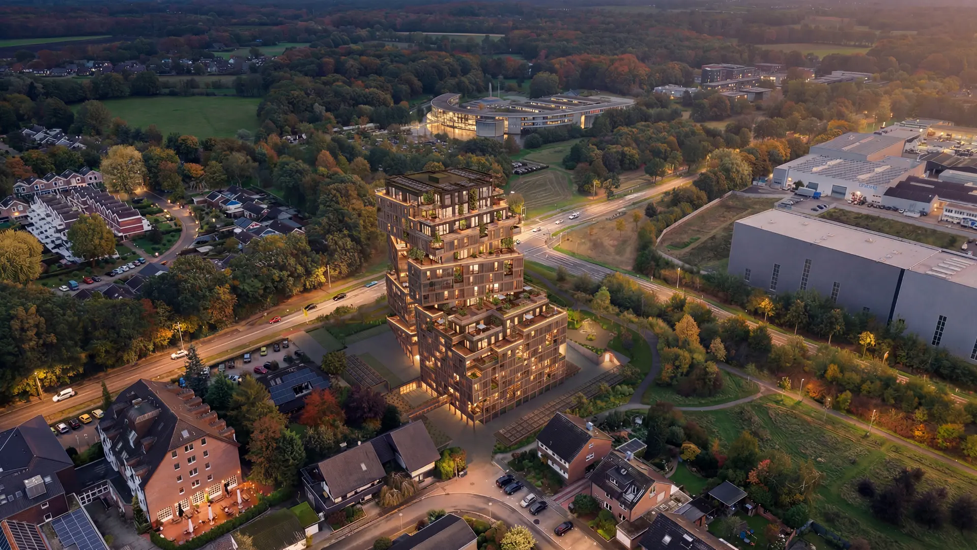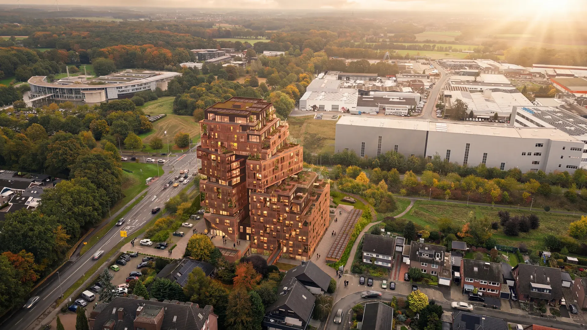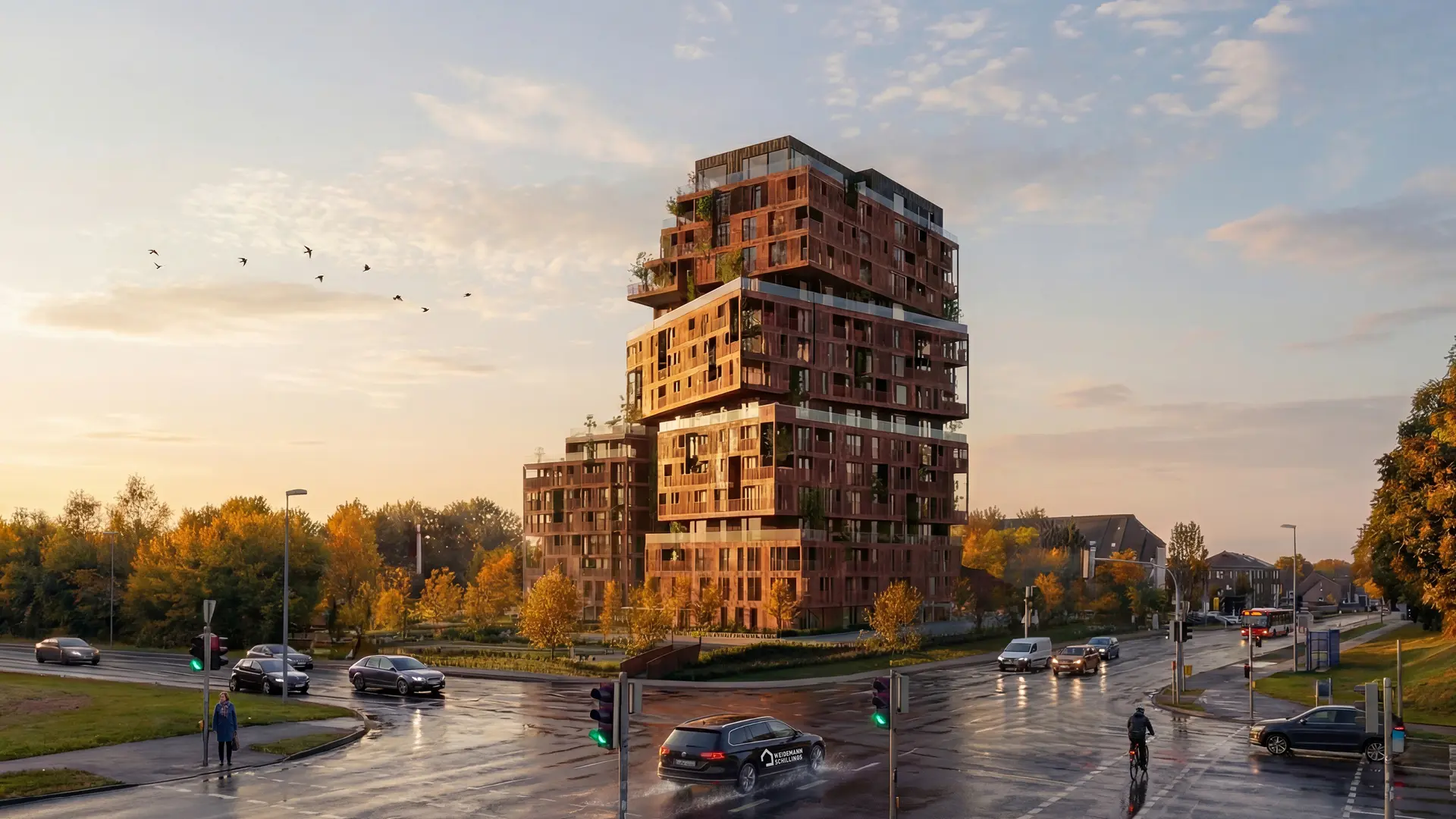 ATEA 2.0 - Visualisierung eines modernen Wohnhochhauses mit terrassierten Baukörpern. Das Gebäude steht an einer Kreuzung, umgeben von herbstlicher Natur und städtischem Umfeld.