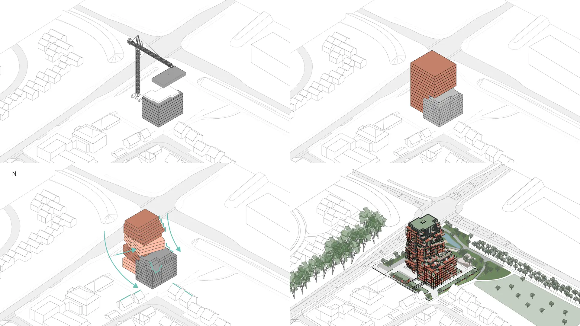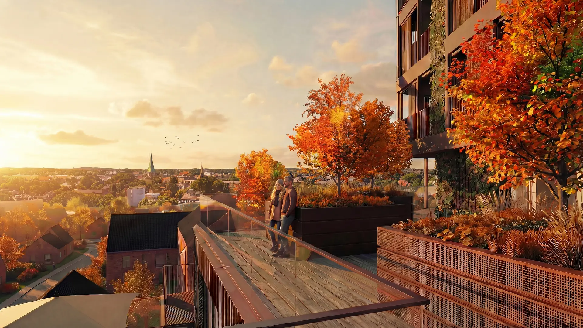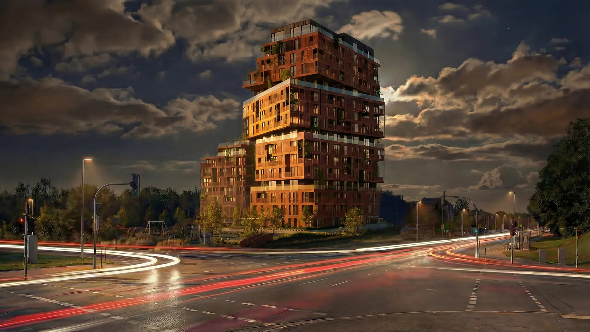 ATEA 2.0 - Visualisierung eines modernen Wohnhochhauses mit terrassierten Baukörpern. Das Gebäude steht an einer Kreuzung, umgeben von herbstlicher Natur und städtischem Umfeld.