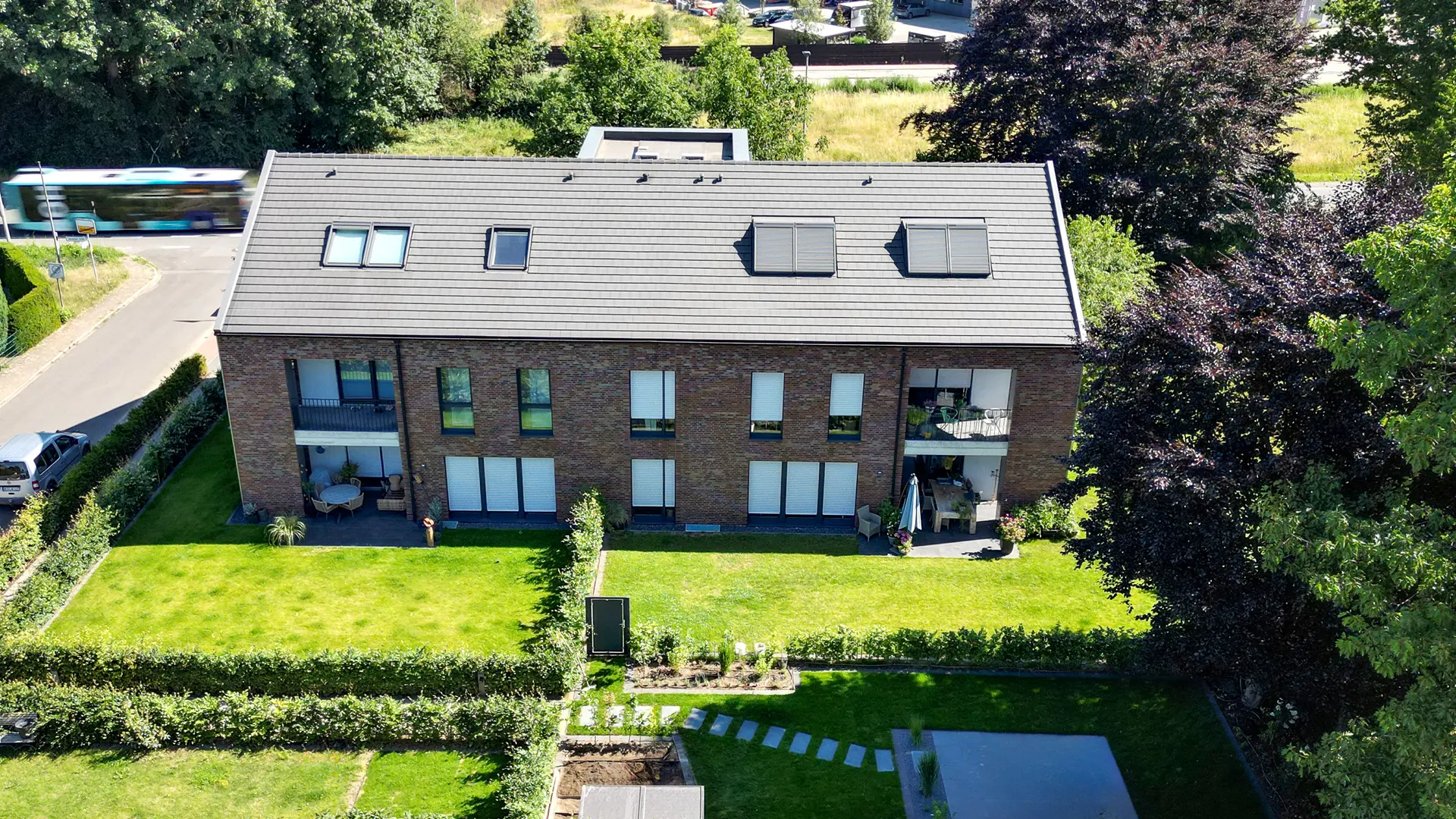 Ein zen­tra­les Gestal­tungs­ele­ment ist die klas­si­sche rote Klin­ker­fas­sa­de, die modern inter­pre­tiert an die regio­na­le Bau­tra­di­ti­on anknüpft. Das über­ste­hen­de Sat­tel­dach an den Gie­bel­sei­ten ver­leiht dem Gebäu­de eine mar­kan­te Sil­hou­et­te. Ergänzt wird das Erschei­nungs­bild durch eine trans­pa­ren­te Ein­gangs­si­tua­ti­on und eine geziel­te Begrü­nung des Vor­plat­zes. Der Neu­bau erfüllt den KfW-Effi­zi­enz­haus-40-Stan­dard. Eine exten­si­ve Dach­be­grü­nung auf dem Neben­ge­bäu­de ver­bes­sert die ther­mi­sche Qua­li­tät und wirkt sich posi­tiv auf das Mikro­kli­ma aus. Der res­sour­cen­scho­nen­de Bau­pro­zess und die nut­zungs­fle­xi­blen Grund­ris­se machen das Pro­jekt lang­fris­tig zukunfts­fä­hig. So ent­steht ein Wohn­ge­bäu­de mit städ­te­bau­li­cher Kon­ti­nui­tät, ener­ge­ti­scher Weit­sicht und archi­tek­to­ni­schem Aus­druck.